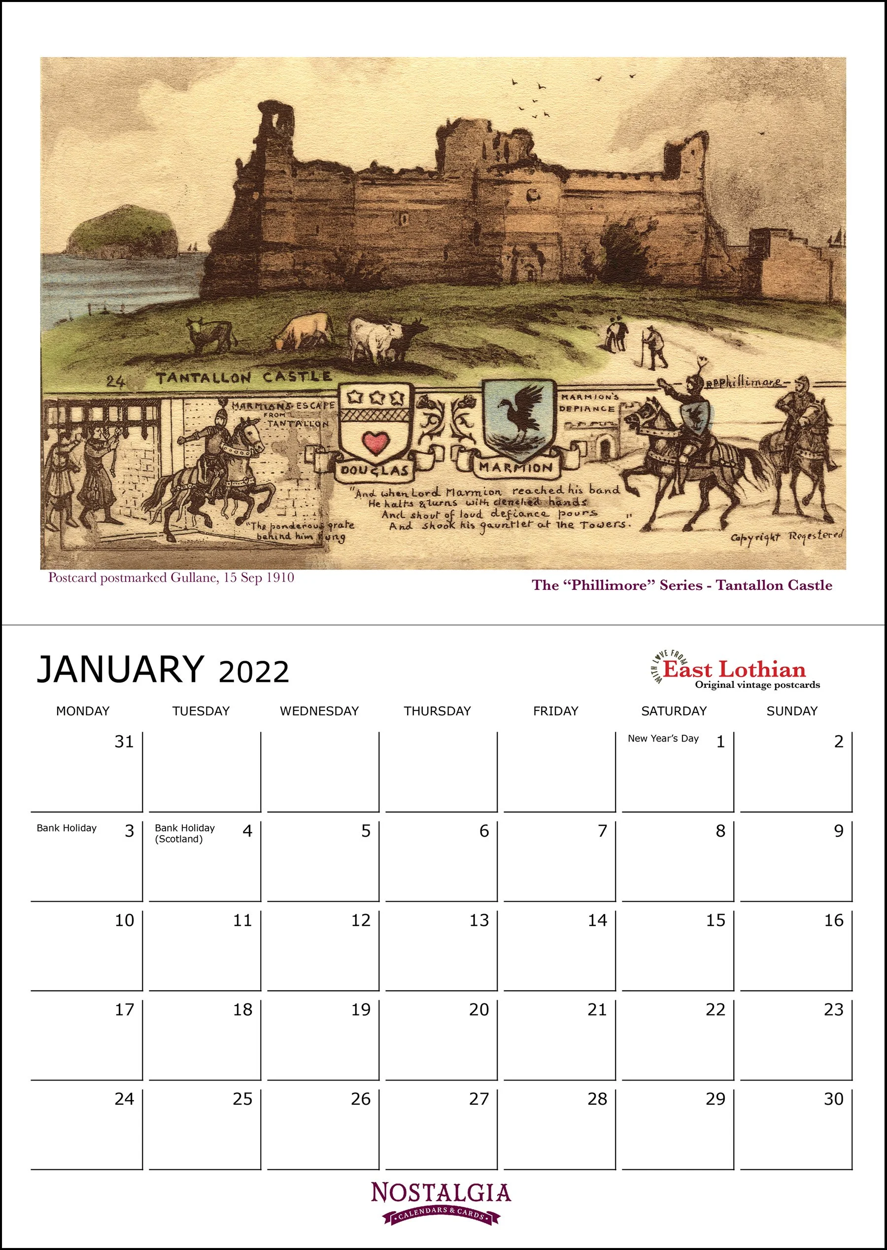 East Lothian Nostalgia Calendar 2022 includes old postcards of Haddington, North Berwick, Dunbar, Fisherrow, Longniddry, East Linton, Musselburgh, Aberlady, Tantallon Castle (by RP Phillimore), Tyninghame, Port Seton and Cockenzie. Amazing!